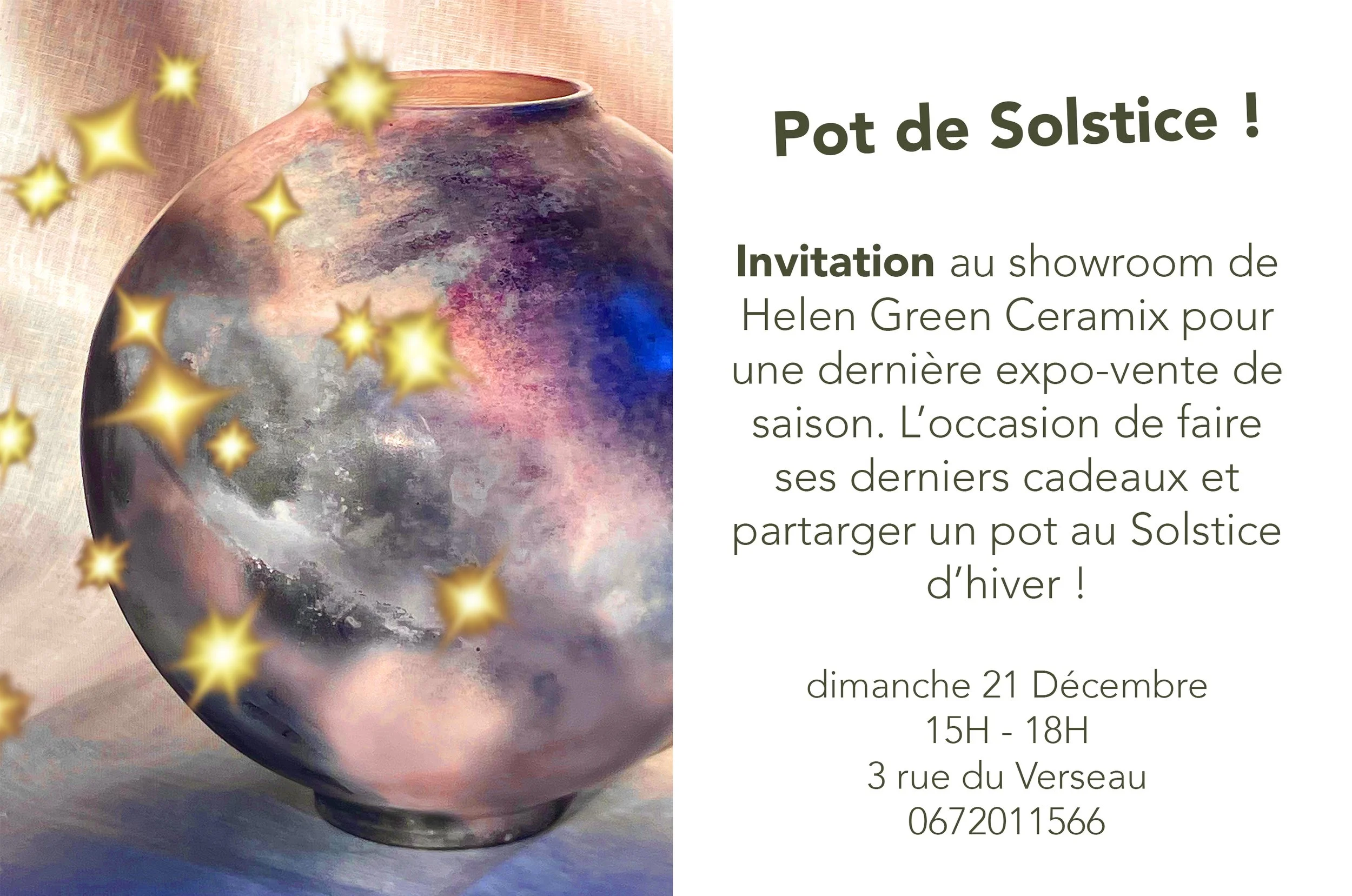 La salle d’expo-vente de l’atelier est ouverte sur rendez-vous. N’hésitez pas à me contacter au 06 72 01 15 66 pour visiter et voir mes nouvelles créations !